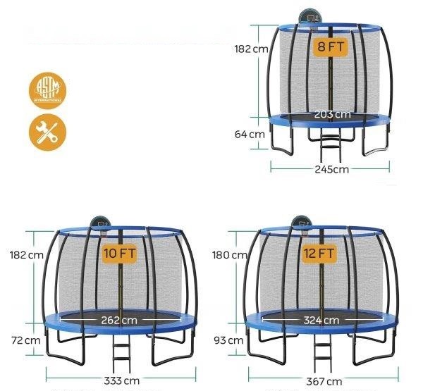 Mėgaukitės aukštesniais ir saugesniais šuoliais su mūsų lauko batutu. Dėl didelio tankio apsauginio tinklo, apsauginio paminkštinimo ir saugos sagčių tėvai gali atsipalaiduoti, kol jų vaikai šokinėja. Dar svarbiau, kad mūsų tinklo stulpai yra išlenkti, todėl tarp stulpų ir tinklo yra pakankamai vietos, apsaugant vaikus nuo traumų, jei jie nukristų. Aukštos kokybės, patvarus šokinėjimo kilimėlis ir tvirtos spyruoklės suteikia neprilygstamą šokinėjimo patirtį. Krepšinio lankas dar labiau padidina linksmybes. Be to, šis lauko batutas su cinkuoto plieno rėmu ir milteliniu būdu dažytomis U formos kojelėmis tarnauja ilgiau nei kiti standartiniai batutai. Surinkimas paprastas naudojant pridedamas instrukcijas ir priedus. Pastaba: Visas komplektas pristatomas 2 dėžėse arba 3 dėžėse, ir jas galite gauti skirtingu laiku.