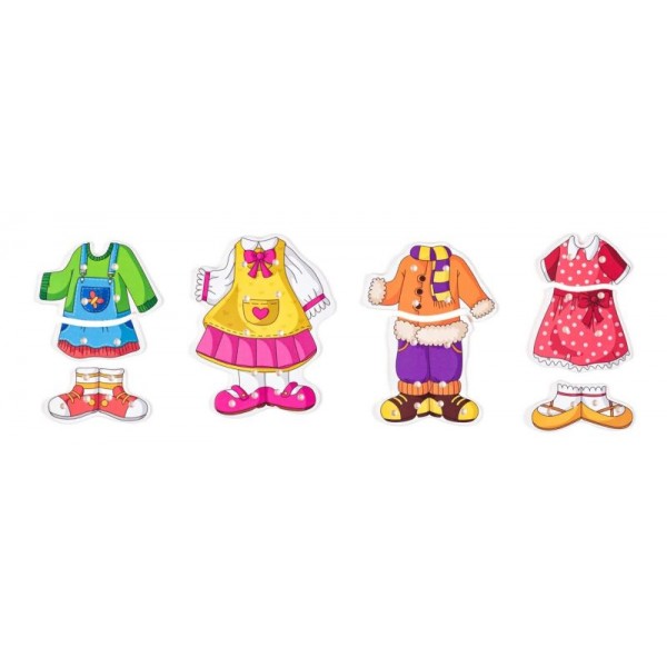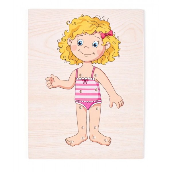 Medinis žaidimas Aprenk mergaitę. Medinė dėžutė su užstumiamu dangteliu, kuriame vaizduojama mergaotė; taip pat - 6 skirtingi mediniai aprangos elementų piešinėliai (megztinis, kelnės su batais, marškinėliai, kt.); vaikas gali "prisiūti" drabužėlius prie mergaitės, naudodamas 4 skirtingų spalvų raištelius; Lavina rankų motoriką. Skatina kūrybiškai mąstyti.
