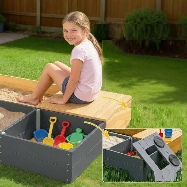 ✔ Sėdynė ir darbastalio dangčiai pakeliami, kad būtų galima patogiai pailsėti žaidžiant šioje smėlio dėžėje.
