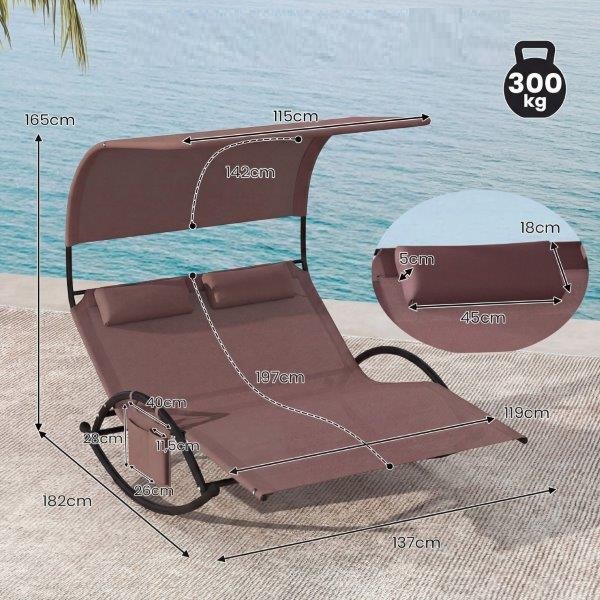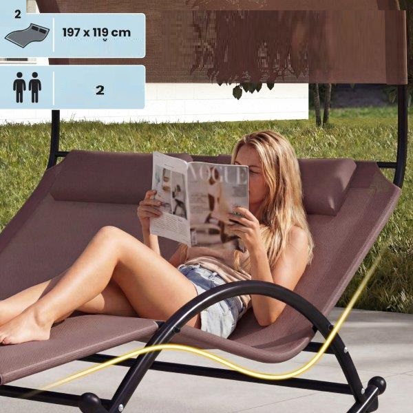 Dėl plačios sėdynės ir ergonomiško dizaino šis terasos gultas patogiai talpina iki dviejų žmonių (300 kg). Neslystantis pagrindas su stabdikliais užtikrina sklandų supimąsi saugioms ir atpalaiduojančioms akimirkoms. Erdvus stogelis suteikia vėsią prieglobstį nuo ryškios saulės, o sėdynės audinys yra patvarus ir greitai džiūstantis. Papuoškite savo baseino zoną ar sodą šia aukštos kokybės dvigule supamąja lova, kuri siūlo tobulą funkcionalumo ir komforto derinį pačioms atpalaiduojančioms akimirkoms.