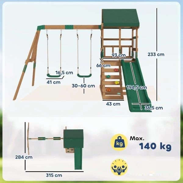 Leiskite savo vaikams juoktis, žaisti ir patirti įdomių sodo nuotykių su šiuo žaidimų bokštu su čiuožykla ir sūpynėmis. Dvi reguliuojamos EVA virvių sūpynės suteikia erdvės suptis kartu, o ilga HDPE čiuožykla nuo 90 cm aukščio platformos užtikrina sklandų slydimo malonumą – įdomu vaikams, ramina tėvus. Tvirtas medinis rėmas, metalinės dalys ir oro sąlygoms atsparios lauko sūpynių medžiagos garantuoja saugų ir lengvai prižiūrimą žaidimą.