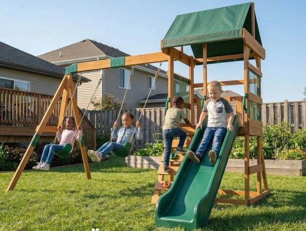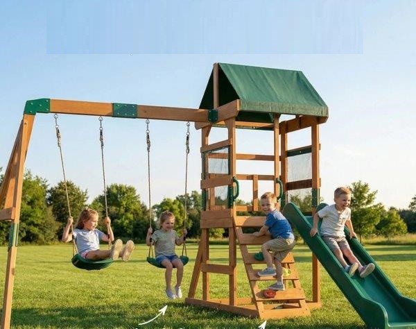 - ✔ Apjungia dvi sūpynes, ilgą čiuožyklą ir laipiojimo sieną nesibaigiančioms pramogoms sode