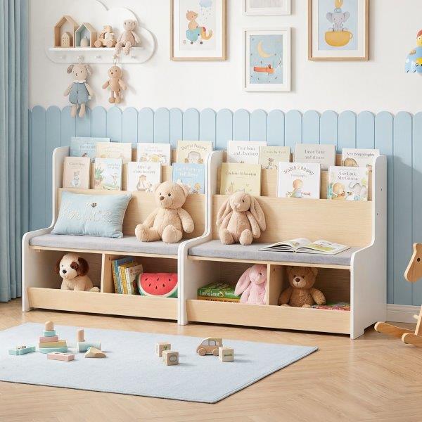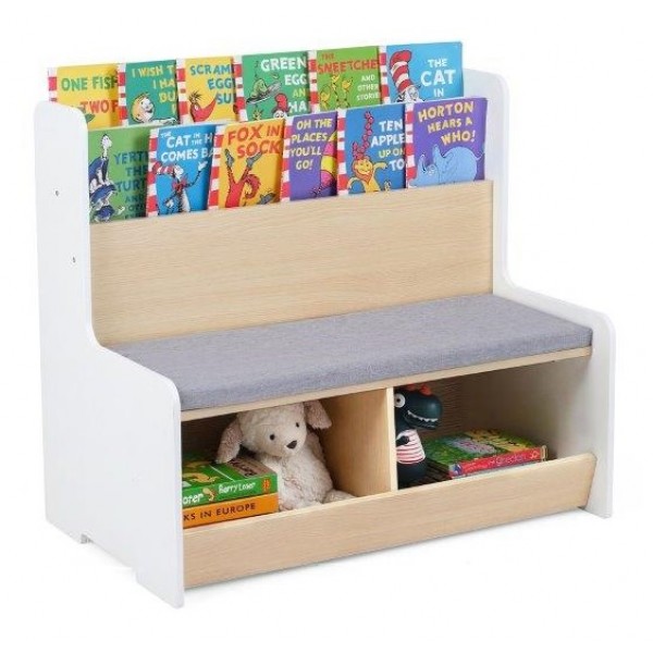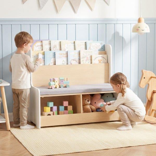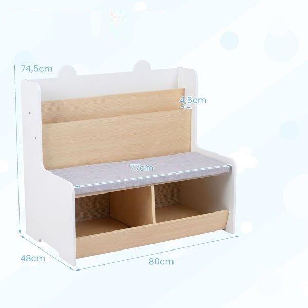 Mūsų universali 3 viename vaikiška knygų lentyna sujungia dviejų pakopų lentyną, du skyrius ir patogų vaikišką suolą su paminkštinta sėdynės pagalvėle. Ji sukuria tvarkingą ir kviečiantį žaidimų ir skaitymo kampelį viename elegantiškame balde. Sukurta specialiai vaikams nuo trejų metų, optimalus aukštis ir atviras dizainas suteikia lengvą prieigą prie žaislų ir knygų. Apvalūs kampai ir apsauginės lentos užtikrina saugumą. Nuimama sėdynės pagalvėlė paverčia ją jaukia skaitymo ir žaidimų zona. Pagamintas iš aukštos kokybės MDF ir aprūpintas tvirtomis, praplatintomis kojelėmis, mūsų vaikiškas daiktadėžės suoliukas garantuoja patvarumą ir stabilumą, kurį dar labiau sustiprina neslystantys EVA grindų kilimėliai. Idealus universalus sprendimas aktyviam vaiko gyvenimui.