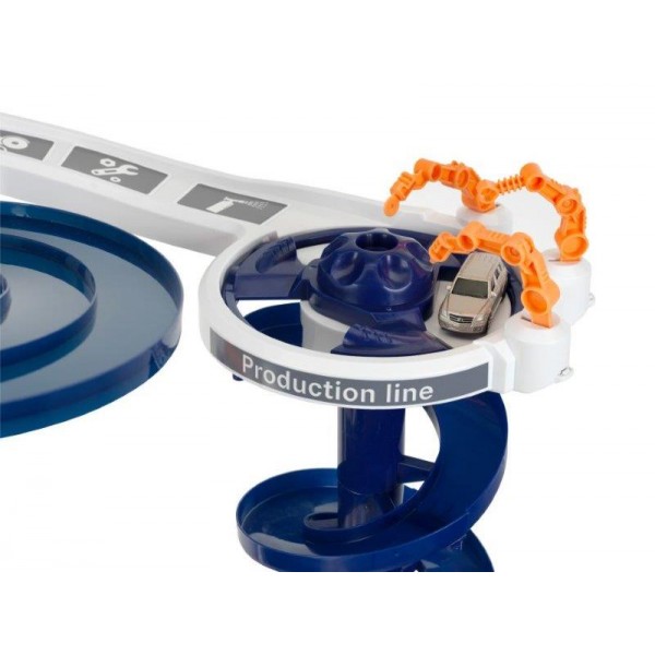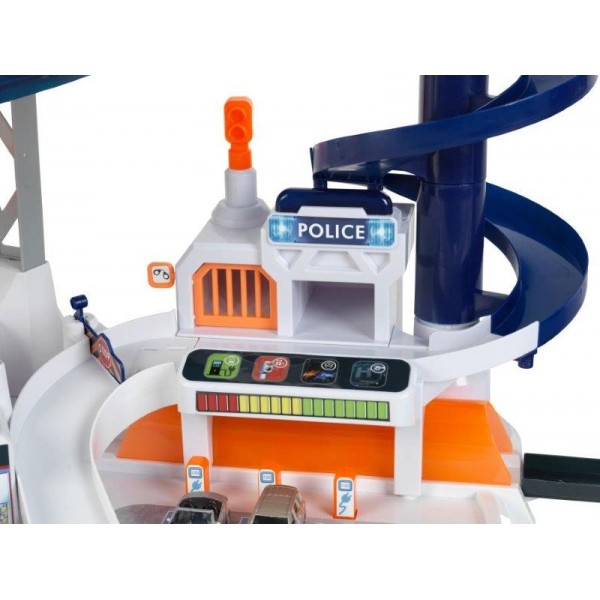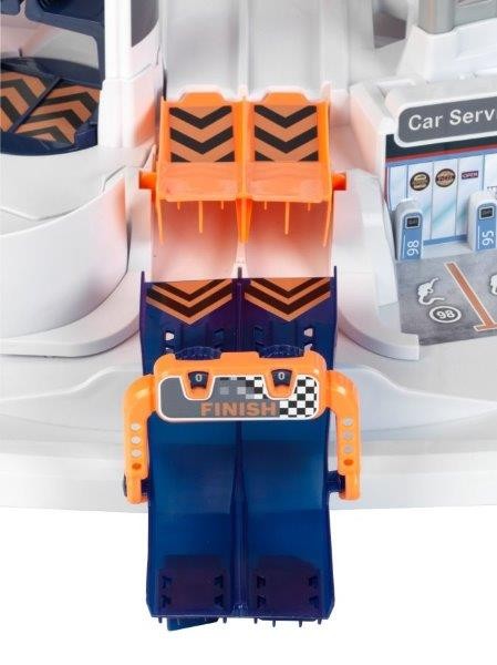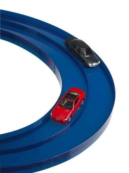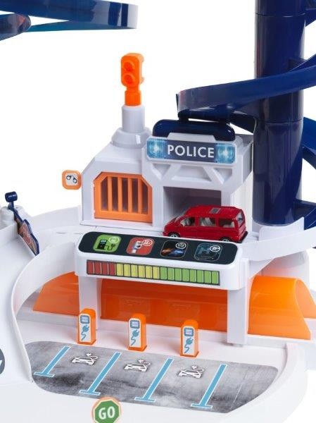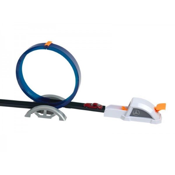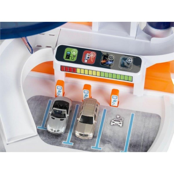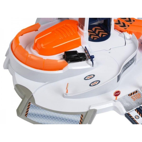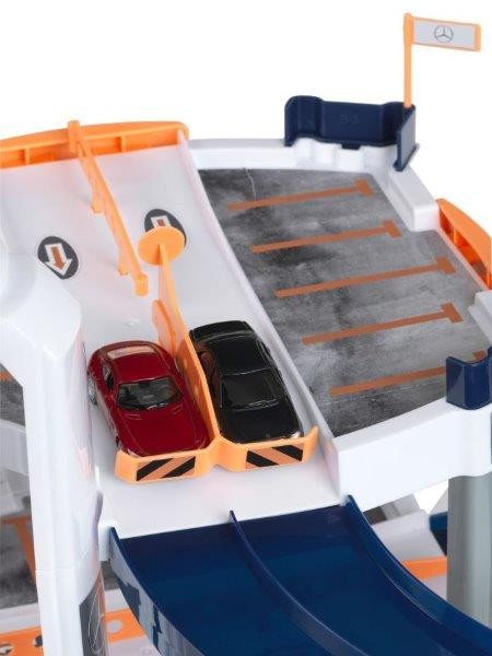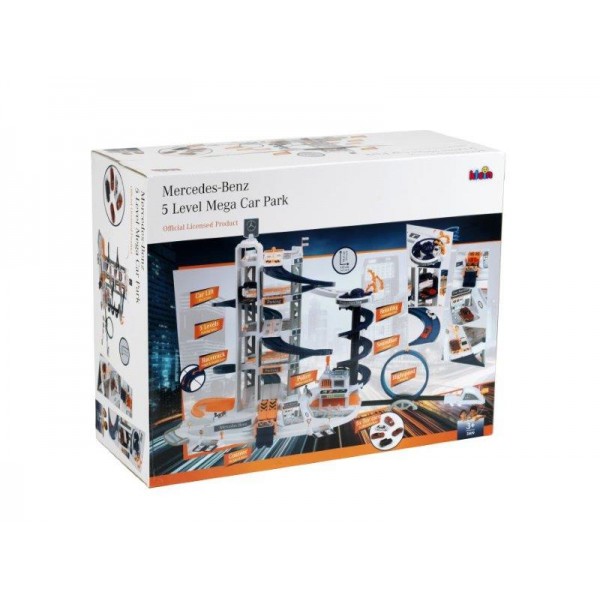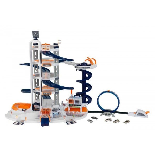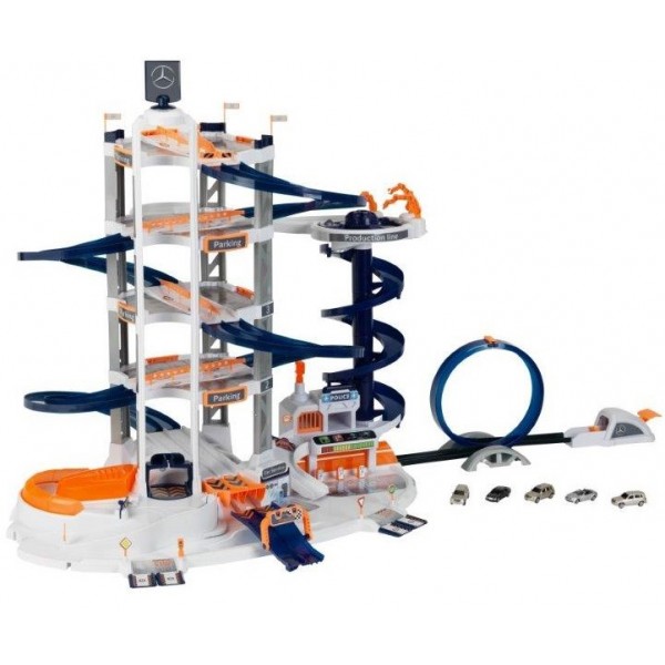 „Mercedes-Benz Mega“ automobilių stovėjimo aikštelė, turinti penkis lygius ir 1:64 mastelį, turi katapultą, kilpą, tunelį ir daugybę kitų elementų. Rinkinyje taip pat yra policijos nuovada su užrakinama kalėjimo kamera, įkrovimo stotelė ir greičio radaras – kiekvienas su šviesos ir garso efektais. Be to, vaikai gali pastatyti penkias transporto priemones (1:64) ir lėkti per įvairius lygius. Elektroninė kabina suteikia įdomios sąveikos, o dvigubos eismo juostos suteikia papildomo vairavimo malonumo.