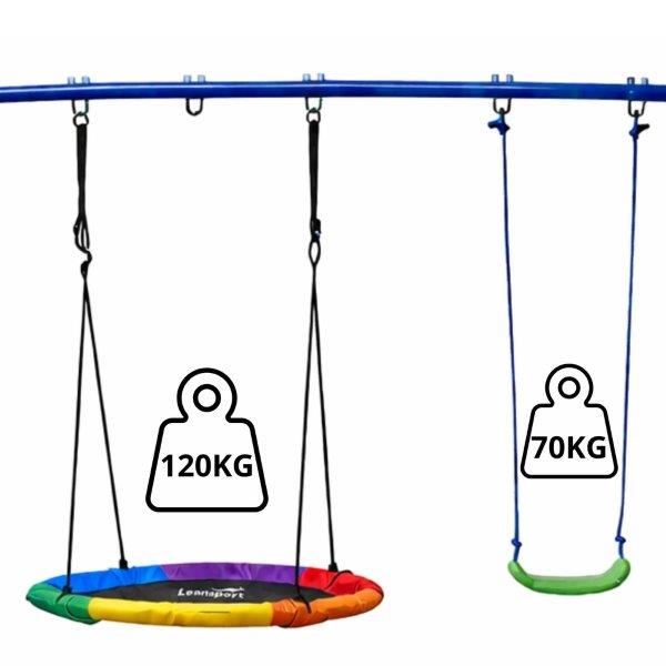 Didelė 100 cm pločio „varnos lizdas“ leidžia patogiai suptis net ir daugiau nei vienam vaikui, o klasikinės sūpynės suteikia dinamišką žaidimą. Krepšinio lankas lavina taikymąsi ir refleksus, o taikinių treniruočių kilimėlis su futbolo kamuoliu dar labiau paįvairina veiklą ir skatina judėjimą.