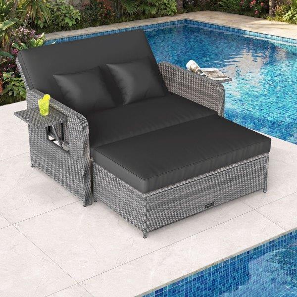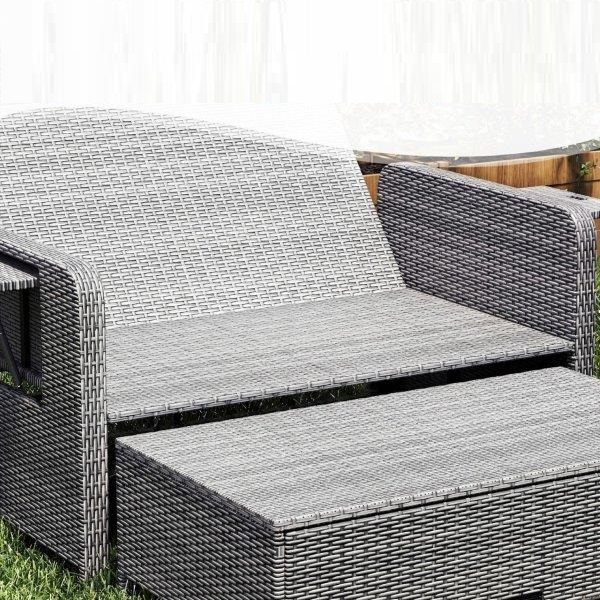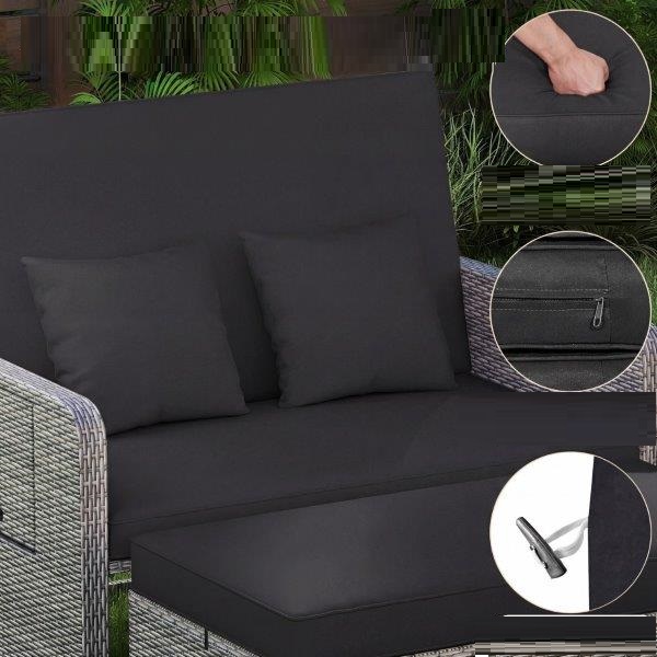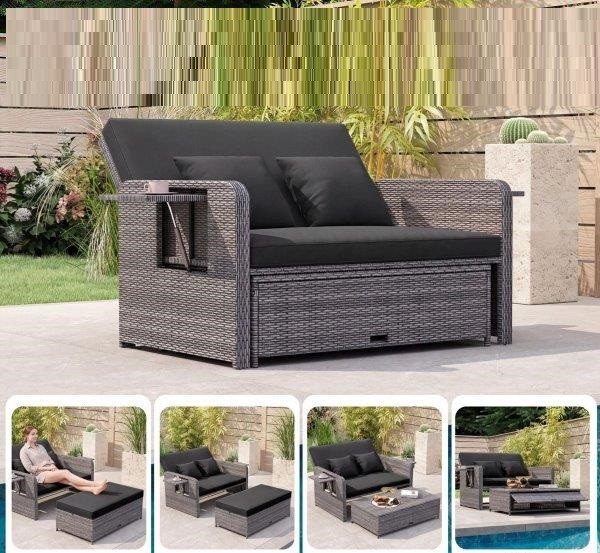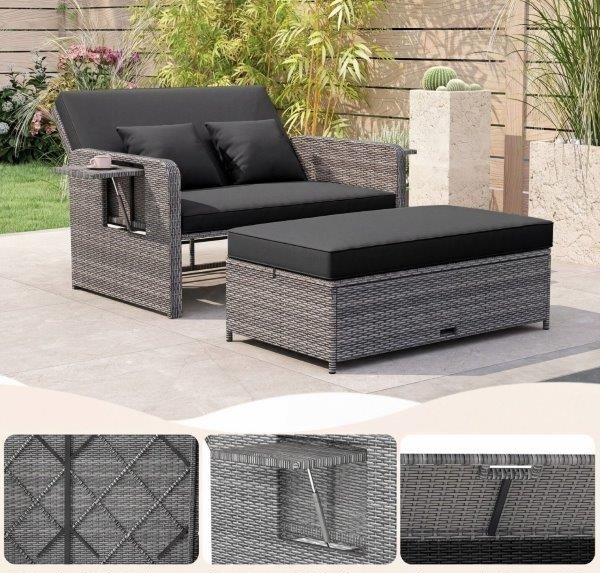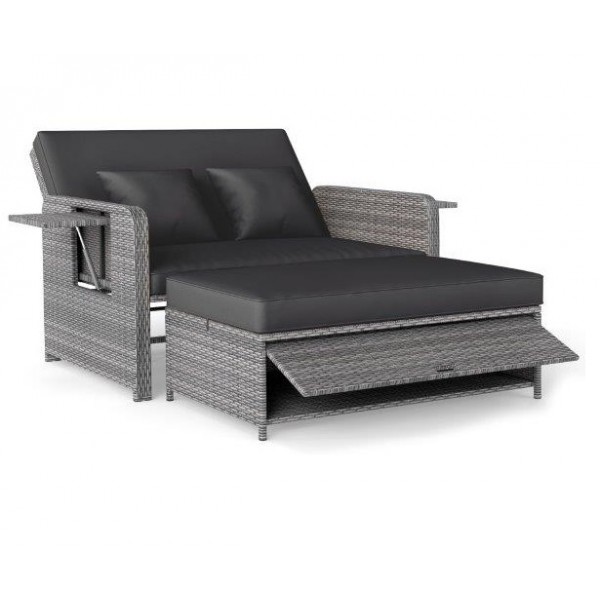 Pagerinkite savo lauko komfortą su šiuo universaliu ir stilingu baldų komplektu, sukurtu tam, kad gerokai pagerintų jūsų atsipalaidavimo patirtį. Atlošas reguliuojamas keturiomis pozicijomis, puikiai prisitaikydamas prie jūsų individualių poreikių, nesvarbu, ar deginatės saulėje, skaitote, ar tiesiog ilsitės. Pagaminta iš aukštos kokybės PE rotango, rudos ir pilkos spalvų mišinio ant tvirto metalinio rėmo, dvigulė sofa ir pufas kartu atlaiko iki 360 kg svorį. Komplektą papildo minkštos, lengvai valomos pagalvėlės. Daugiafunkcis pufas ir du sulankstomi šoniniai staliukai suteikia papildomo komforto. Ši kruopščiai sukurta sofa-lova pavers jūsų terasą ramia ir jaukia gerovės oaze.