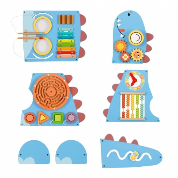 Atraskite magišką dinozaurų pasaulį su edukacinių nuotykių prieskoniu! Ši unikali medinė veiklos lenta, suformuota kaip žavingas dinozauras, yra tikras pramogų centras mažiesiems tyrinėtojams. Šešios skirtingos panelės siūlo daugybę veiklų, kurios užims jūsų vaiką valandų valandas, lavindamos pagrindinius įgūdžius. Kiekvienas elementas buvo kruopščiai sukurtas taip, kad skatintų pažintinį smalsumą ir suteiktų savarankiško atradimo džiaugsmą.