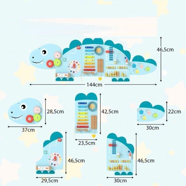 - Visapusiškas Lavinimas: 11-in-1 Montessori sienelė su laikrodžiu, ksilofonu, abaku ir kitais elementais lavina laiko suvokimą, muzikalumą, rankų-akių koordinaciją ir loginį mąstymą.