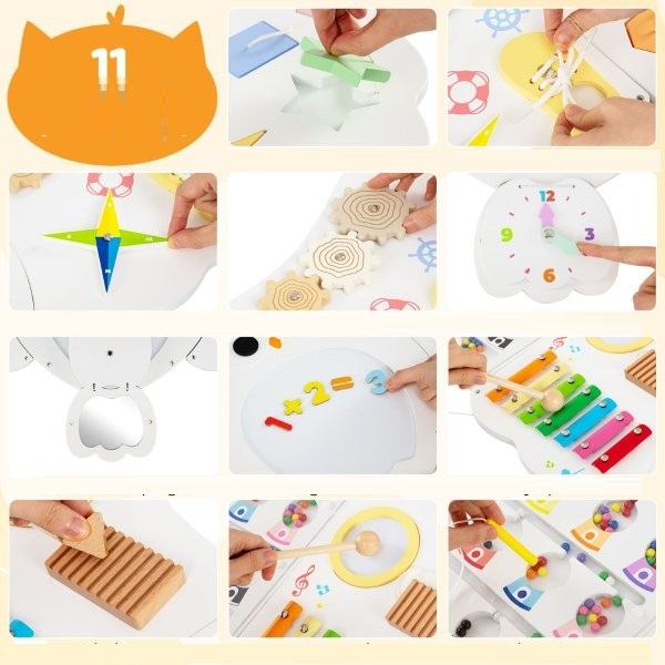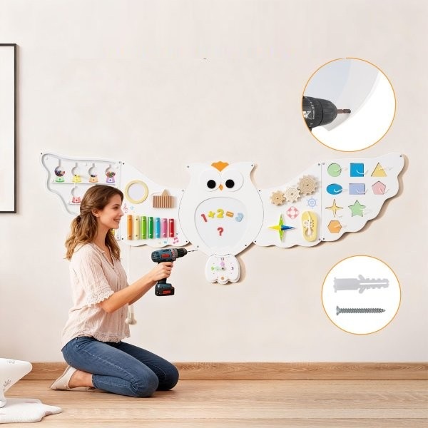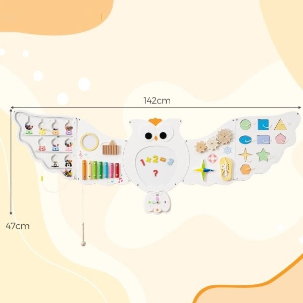 Ši spalvinga sensorinė lenta, kurioje gausu formų ir spalvų rūšiavimo žaidimų, besisukančių krumpliaračių, batraiščių, kompaso, ksilofono, grandiklio, magnetinės lentos, laikrodžio ir paslėpto veidrodėlio apačioje, užims smalsias rankeles, lavins smulkiąją motoriką ir sužadins meilę matematikos mokymuisi. Vaikai gali rašyti ir spręsti lygtis ant magnetinės lentos – nereikia nei ekrano, nei popieriaus! Pagaminta iš vaikams saugių medžiagų su lygiais, užapvalintais kraštais, akį traukiantis pelėdos dizainas yra įsimintina dovana gimtadieniams ar šventėms, kurią mėgsta tiek vaikai, tiek tėvai, tiek mokytojai.
