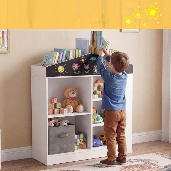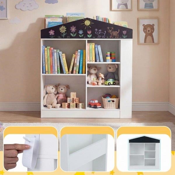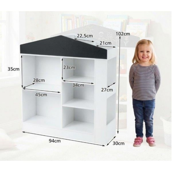 Sukurkite saugią skaitymo ir žaidimų zoną su šia vaikiška namelio formos knygų lentyna su kreidine lenta. Žavus balto namelio dizainas paverčia ją tikra bet kurio vaiko kambario ar žaidimų kambario puošmena, o 5 lentynos, 2 šoniniai skyriai ir 4 viršutinės lentynos leidžia tvarkingai laikyti knygas, žaidimus ir rankdarbių reikmenis. Ši lentyna, naudojama ir kaip knygų, ir žaislų lentyna, padeda vaikams savarankiškai rūšiuoti mėgstamiausius daiktus. 102 cm aukščio ši vaikiška knygų lentyna idealiai tinka vaikams nuo 3 metų, nes jiems lengva išimti daiktus ir juos sudėti atgal. Du apsaugos nuo apvirtimo įtaisai ir apsauginis turėklas suteikia ramybės kasdieniame šeimos gyvenime.