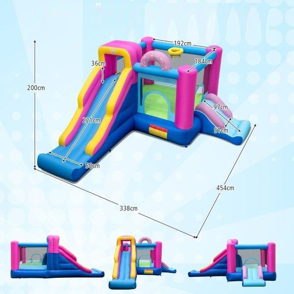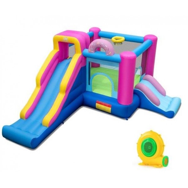 Pripučiama pilis + 680 W pūstuvo komplektas su laipiojimo siena ir krepšinio lanku