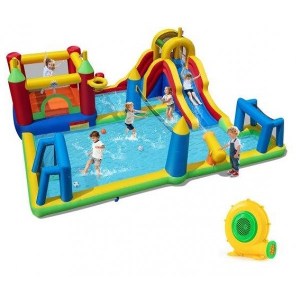 Ištisus metus veikianti vandens žaidimų aikštelė: paverskite savo sodą mini vandens parku: ilga vandens čiuožykla, erdvi šokinėjimo zona, laipiojimo siena su rankenomis, bokso kriaušė, negilus vaikų baseinėlis su vandens patranka ir 3 žaidimai (krepšinis/futbolas/tinklinis). Galima naudoti tiek šlapiu, tiek sausu oru, todėl vaikai galės smagiai leisti laiką nuo pavasario iki rudens.