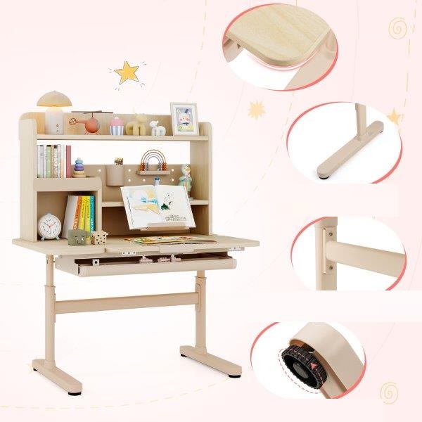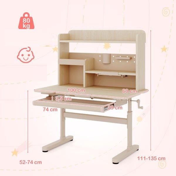 Vaikiškas rašomasis stalas su lentyna, stalčiumi ir reguliuojamo aukščiu (Natūrali)