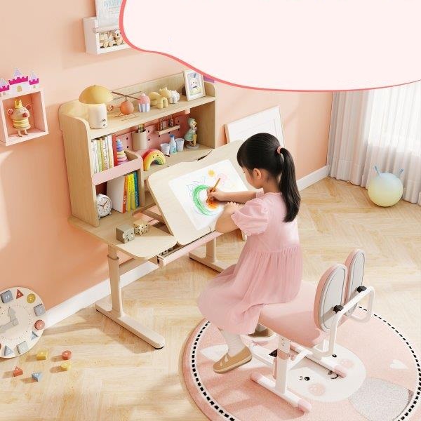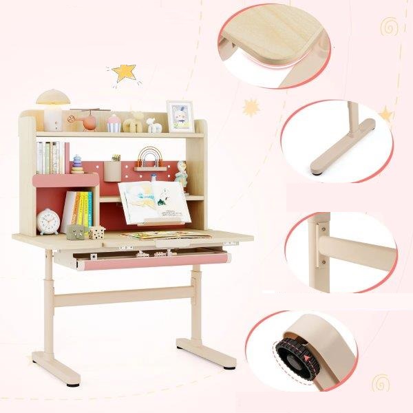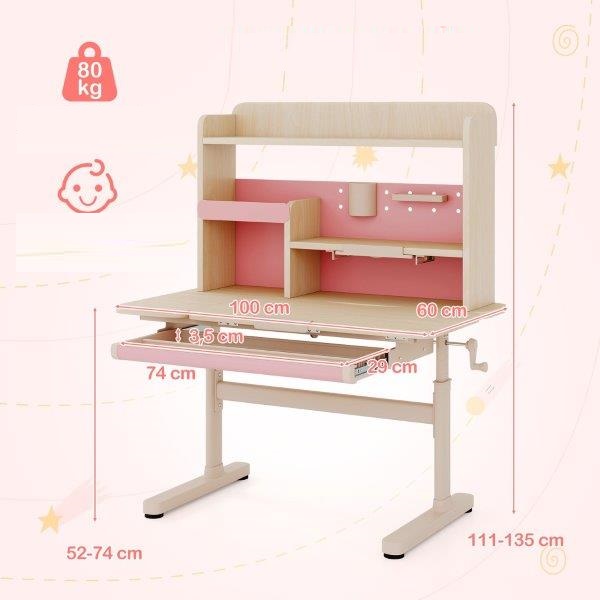 Vaikiškas rašomasis stalas su lentyna, stalčiumi ir reguliuojamo aukščiu (Rožinė)