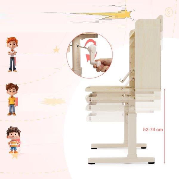 Sukurkite įkvepiančią mokymosi aplinką savo vaikui! Šis reguliuojamo aukščio stalas gali augti kartu su jūsų vaiku, užtikrindamas tobulą laikyseną atliekant namų darbus, meno projektus ir kt. Pakreipiamas stalviršis pagerina mažųjų besimokančiųjų susikaupimą ir patogumą, jis tinka rašymui (0°–15°), skaitymui (15°–30°) ir piešimui (30°–60°). Tvarkymąsi palengvina daiktų laikymo skyriai, patogus akių lygyje esantis knygų stovas, rašiklių laikiklis ir stalčius su skirtukais. Šis stalas užtikrina stabilumą ir ilgaamžiškumą dėl tvirtų metalinių kojelių. Pagerinkite savo vaiko mokymosi efektyvumą su stalu, kuris padės jo mokymosi kelyje.