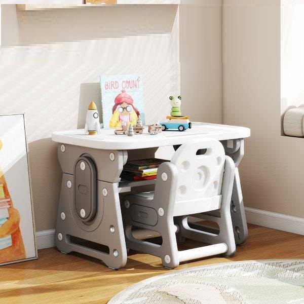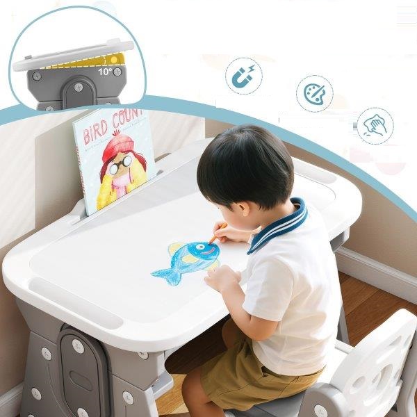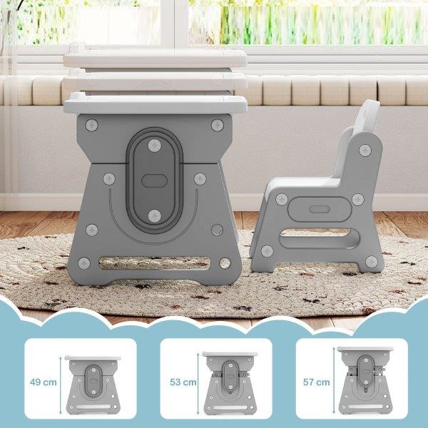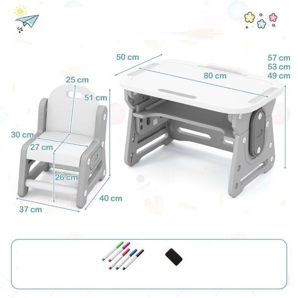 Šis universalus vaikiško stalo ir kėdės komplektas yra idealus pasirinkimas skaitymui, rašymui ir piešimui. Pakreipiama lenta leidžia vaikams patogiai piešti. Lenta yra dažoma ir valoma. Vaikai taip pat gali reguliuoti stalo aukštį pagal savo skirtingus poreikius. Įgaubta lentyna ir pieštukų kišenės suteikia daug vietos daiktams susidėti. Ergonomiška atlošas ir lygi sėdynė užtikrina maksimalų komfortą. Suapvalinti stalo ir kėdės kampai sukuria saugią žaidimų ar mokymosi zoną.