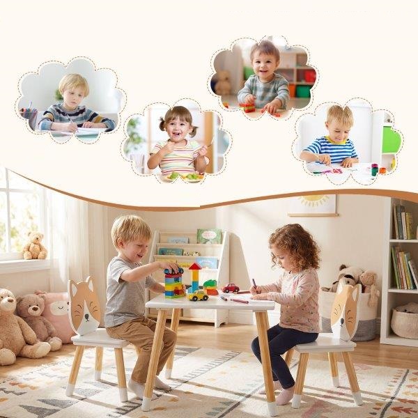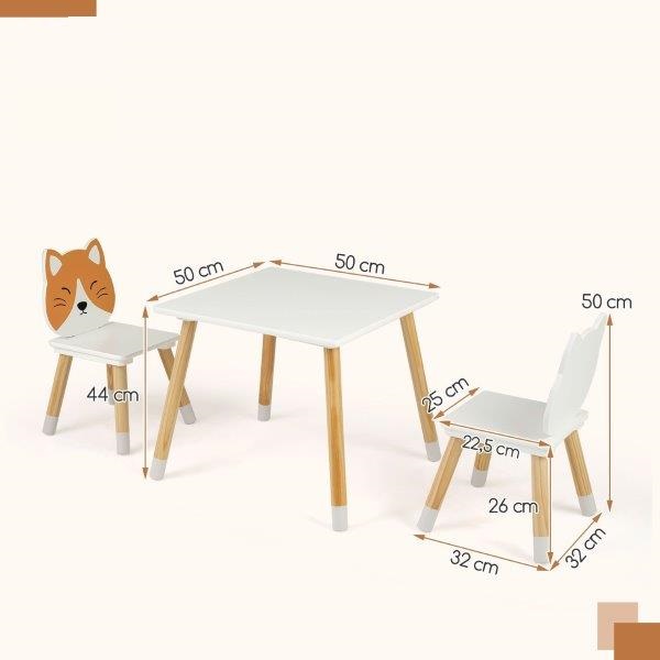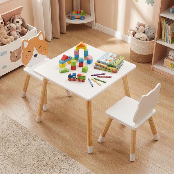 Sukurkite vaikams jaukią ir žaismingą erdvę su šiuo stalo ir kėdžių komplektu! Šis vaikiško stalo ir kėdžių komplektas, sukurtas galvojant apie saugumą, pasižymi lygiais, užapvalintais kraštais ir tvirtomis prisukamomis jungtimis, kad būtų išvengta smūgių ir užtikrintas stabilumas kasdienio naudojimo metu. Tvirtos pušies kojelės suteikia mažylių stalo ir kėdžių komplektui nesenstantį natūralų grožį ir ilgaamžiškumą.