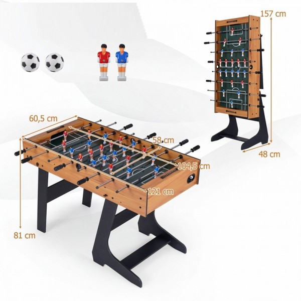 Parsineškite greito tempo stalo futbolo jaudulį namo su šiuo kompaktišku stalo futbolo stalu, turinčiu tvirtą MDF rėmą, skirtą tikroms kovoms. Lanksčios, reguliuojamos rankenėlės leidžia greitai sulankstyti stalą, todėl po rungtynių jis kompaktiškai pasislepia, išlaikant tvarką jūsų gyvenamojoje erdvėje. Ergonomiškos, neslystančios rankenos ir sustiprinti metaliniai strypai užtikrina tikslų valdymą, o stalas yra paruoštas žaisti su 22 žaidėjų figūrėlėmis, 2 švieslentėmis ir 2 kamuoliukais. Žaidimo aikštelė su baudos aikštelėmis, vartais ir atšokimo mechanizmais padidina greitį, stiprina komandinį darbą, strateginį mąstymą ir akių bei rankų koordinaciją, todėl stalo futbolas yra žaidimas, jungiantis kartas.