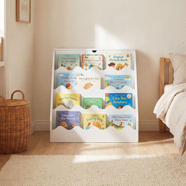 - 4 pakopų knygų lentyna tvarkingai ir lengvai pasiekiamoje vietoje laiko vaikų knygas.