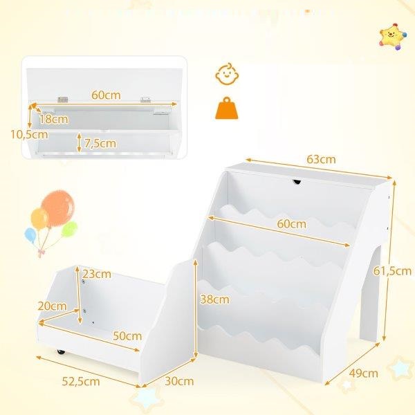 Ši Montessori vaikiška lentyna siūlo praktišką daiktų laikymo vietą ir vaikams pritaikytą dizainą. Atlenkiamas skyrius, keturios lentynos ir ištraukiamas stalčius suteikia vietos knygoms, žaislams ir asmeniniams daiktams. Mobilus daiktadėžės vežimėlis su ratukais yra lengvai perkeliamas ir, kai nenaudojamas, gali būti laikomas už lentynos. Būdami 61,5 cm ūgio, 3 metų ir vyresni vaikai gali savarankiškai pasirinkti ir susitvarkyti savo knygas bei žaislus. Pagaminta iš tvirtos MDF plokštės ir aprūpinta dviem apsaugos nuo apvirtimo įtaisais, lentyna užtikrina papildomą stabilumą ir saugumą. Suapvalinti kampai ir lygus paviršius užtikrina saugią naudojimo patirtį. Žaismingi, banguoti kraštai paverčia lentyną patraukliu baldu vaikų kambariuose ar žaidimų kambariuose.