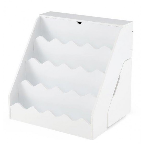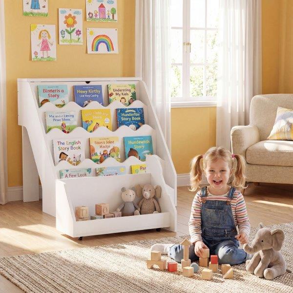 Vaikiška knygų lentyna su išlankstomu stalčiumi ir ratukais (Balta)