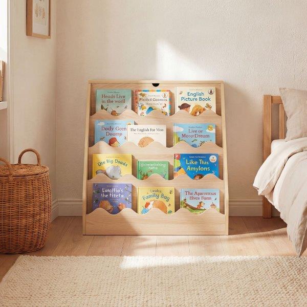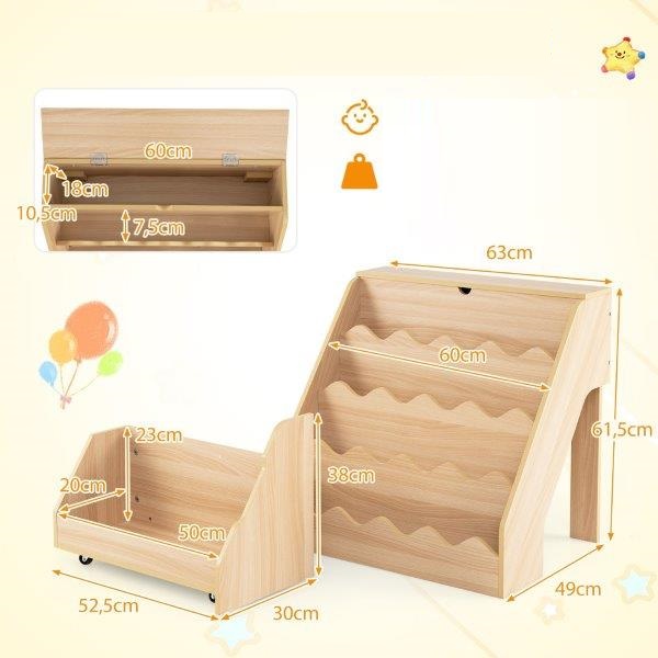 Ši Montessori vaikiška lentyna siūlo praktišką daiktų laikymo vietą ir vaikams pritaikytą dizainą. Atlenkiamas skyrius, keturios lentynos ir ištraukiamas stalčius suteikia vietos knygoms, žaislams ir asmeniniams daiktams. Mobilus daiktadėžės vežimėlis su ratukais yra lengvai perkeliamas ir, kai nenaudojamas, gali būti laikomas už lentynos. Būdami 61,5 cm ūgio, 3 metų ir vyresni vaikai gali savarankiškai pasirinkti ir susitvarkyti savo knygas bei žaislus. Pagaminta iš tvirtos MDF plokštės ir aprūpinta dviem apsaugos nuo apvirtimo įtaisais, lentyna užtikrina papildomą stabilumą ir saugumą. Suapvalinti kampai ir lygus paviršius užtikrina saugią naudojimo patirtį. Žaismingi, banguoti kraštai paverčia lentyną patraukliu baldu vaikų kambariuose ar žaidimų kambariuose.