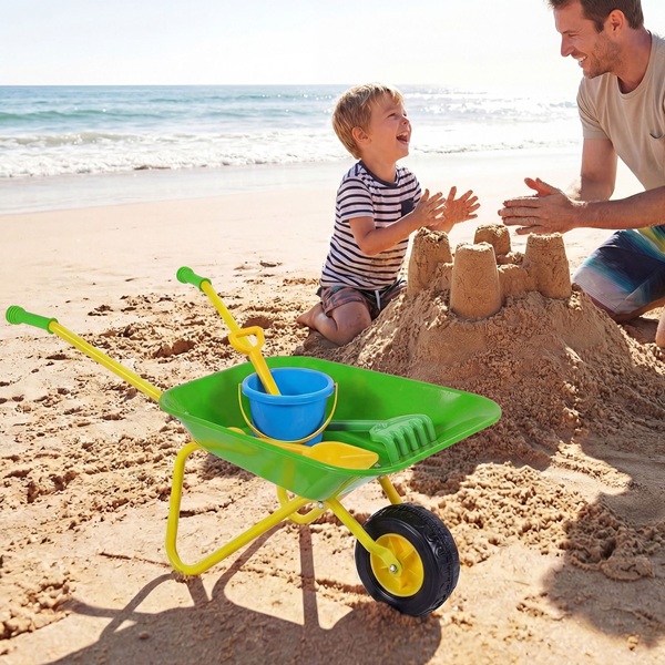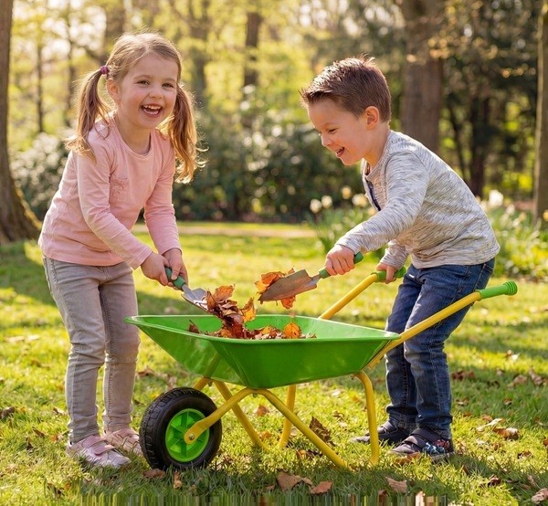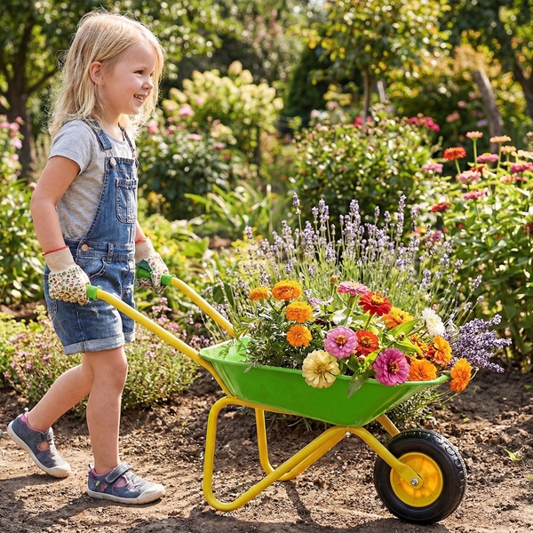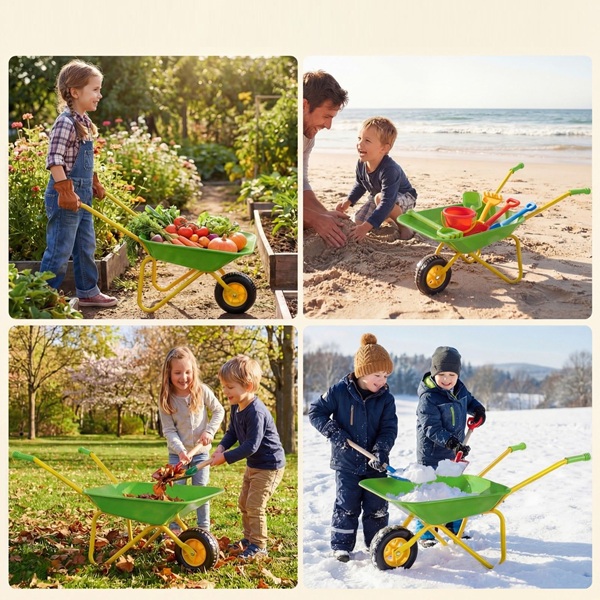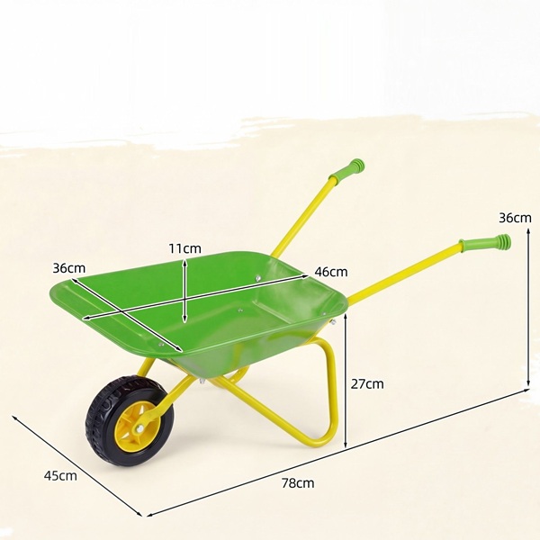 Šis vaikiškas sodo vežimėlis sukurtas ilgalaikiam naudojimui ir pasižymi tvirtu metaliniu rėmu, vientisa pakrovimo platforma ir patikimu stovėjimo stabdžiu, kuris atlaikys daugybę nuotykių. Lygūs, nesubraižyti kraštai ir neslystančios rankenos užtikrina saugų ir patogų sukibimą mažoms rankytėms. Jis gali gabenti iki 15 kg svorį ir yra pakankamai universalus, kad galėtų gabenti šviežias daržoves, smėlį, sniegą ar lapus – begalinėms pramogoms. Aprūpintas tvirta padanga, jis lengvai slysta per žolę, purvą, grindinį ir kt. – idealiai tinka žaisti lauke bet kuriuo metų laiku. Rekomenduojama vaikams nuo 3 metų amžiaus. Be pramogų, jis skatina tokius lavinamuosius įgūdžius kaip koordinacija, atsakomybė ir komandinis darbas, paversdamas žaidimo laiką prasmingomis šeimos akimirkomis, kupinomis mokymosi ir bendrystės.