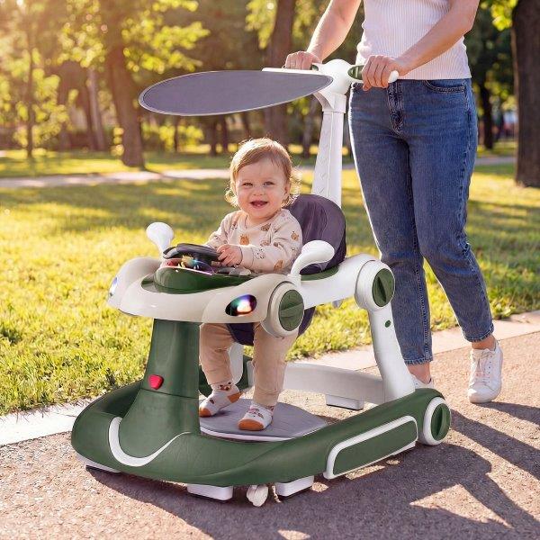 Pasiruošę paversti savo kūdikio pirmuosius žingsnius džiaugsmingais atradimais? Mūsų daugiafunkcis vaikštynė ne tik padeda žengti pirmuosius žingsnius! Nuo nuo saulės apsaugoto vežimėlio iki linksmo supamojo arkliuko, smagios šokinėjimo kėdutės, šaunios vaikštynės ir praktiškos maitinimo kėdutės – kiekviena funkcija sukurta augti kartu su jūsų kūdikiu nuo 7 iki 18 mėnesių amžiaus. Saugumas yra mūsų svarbiausias prioritetas, nes jis apsaugo nuo apvirtimo, tarpai yra apsaugoti nuo suspaudimo ir greičio reguliavimas, kad žaidimai būtų be rūpesčių! Be to, veiklos centras džiugina šviesomis ir muzika, kuri sužadins smalsumą. Lengva valyti dėl nuimamos pagalvėlės ir greitai surenkama – puikiai tinka pramogoms. Įsigykite šį būtiną pagalbininką ir paverskite kiekvieną dieną nuostabia mokymosi kelione savo mažajam tyrinėtojui!