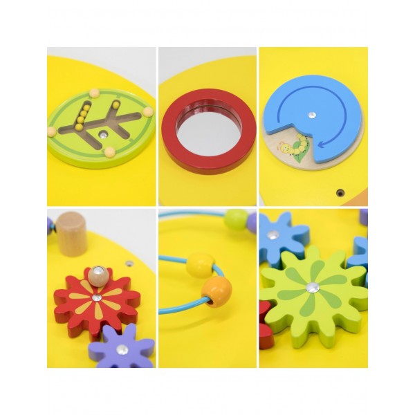 - 3 panelė (rūšiuotojas): lavinamoji panelė su atitinkamomis pagrindinėmis geometrinėmis figūromis (širdis, kvadratas, apskritimas, trikampis). - 4 panelė (variklis): tarpusavyje sujungtų, spalvingų krumpliaračių sistema ir klasikinis susipynimas (variklio kilpa) su mediniais karoliukais.