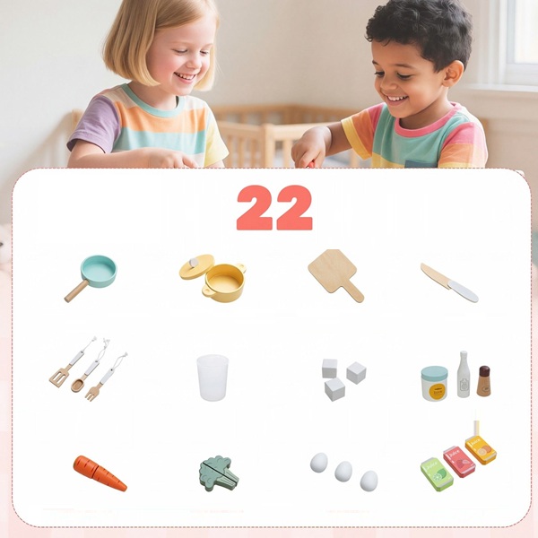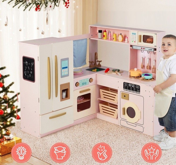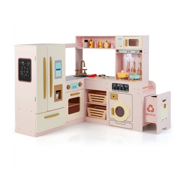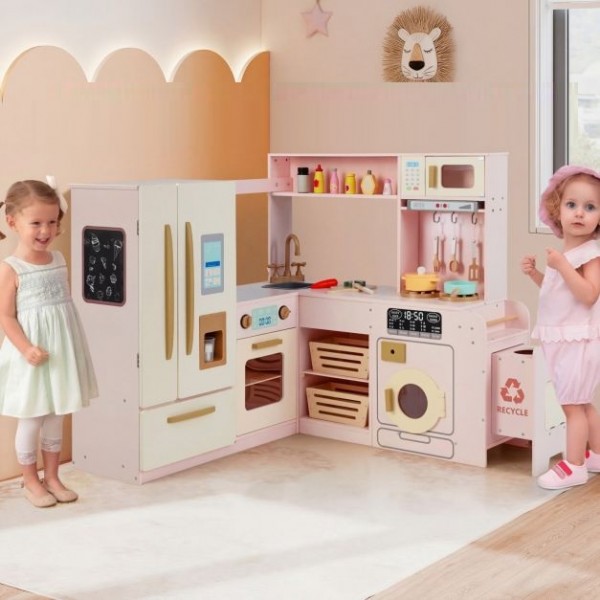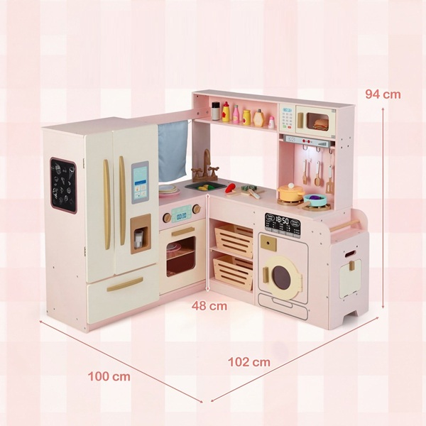Leiskite savo vaikams pasinerti į maisto gaminimo pasaulį su mūsų dideliu mediniu kampiniu virtuvės komplektu! Unikalus kampinis dizainas optimaliai išnaudoja erdvę, tačiau yra pakankamai didelis, kad kartu galėtų žaisti keli vaikai. Kampinė žaidimų virtuvė yra pilnai aprūpinta tikroviškomis detalėmis, tokiomis kaip dviduris šaldytuvas su šaldiklio skyriumi, ištraukiama šiukšliadėžė ir autentiški šviesos bei garso efektai ant gartraukio ir viryklės, kurie pagerina žaidimo patirtį. Vaikai gali piešti ant kreidinės lentos, karpyti ant stalviršių, kepti orkaitėje, plauti indus kriauklėje ir šildyti maistą mikrobangų krosnelėje. Rinkinyje taip pat yra įvairių priedų, tokių kaip virtuvės reikmenys ir žaislinis maistas, kad linksmybės nesibaigtų.
