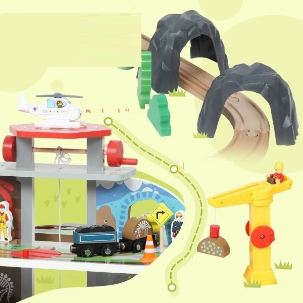 Ar jūsų vaikas visada žaidžia tuos pačius žaidimus ir jam nusibosta įprasti žaislai? Šis medinis traukinių rinkinys kaskart žaidžiant atneša naujų nuotykių. Mažieji statybininkai valdo rankinį kraną ir leidžiasi į nuotykius keturiuose kasyklos lygiuose. Šis vaikiškas traukinių rinkinys, sudarytas iš 79 detalių, skatina nuolatinį konstravimą ir ryškų pasakojimą, todėl kiekvienas žaidimo laikas tampa nauja, aktyvia patirtimi.