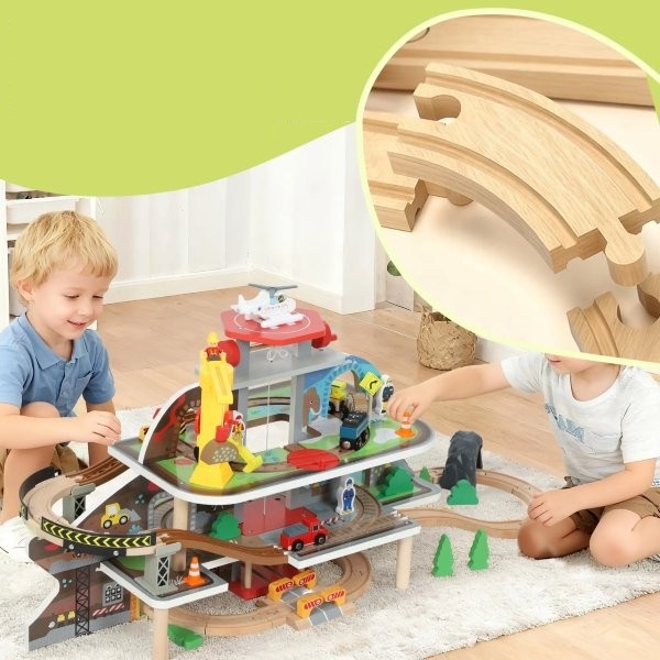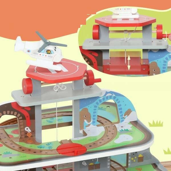 ✔ Medinis traukinių rinkinys turi 4 lygių konstrukciją su sraigtasparnių nusileidimo aikštele, skatinančia erdvinį ir loginį mąstymą