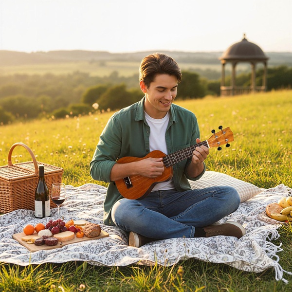 Raudonmedžio ukulelės komplektas su nešiojimo dėklu, mediatorius, reguliuojamas dirželis