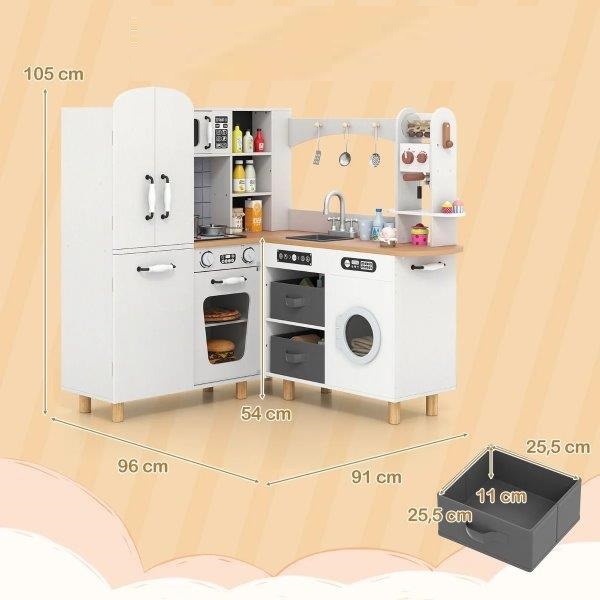 Žaidimas susitinka su vaizduote ir kūrybiškumu mūsų kampinėje žaidimų virtuvėlėje vaikams! Ši didelė medinė žaidimų virtuvė siūlo apgalvotą, erdvę taupantį sprendimą, kuris puikiai tinka bet kuriam kambario kampeliui, maksimaliai išnaudodamas žaidimų erdvę be ankštumo pojūčio. Virimo paviršiai atgyja šviesomis ir garsais, kviesdami mažuosius virėjus leistis į išradingus maisto gaminimo nuotykius. Be maisto gaminimo, rinkinyje taip pat yra šaldytuvas, mikrobangų krosnelė, kriauklė, orkaitė, skalbimo mašina ir kavos virimo aparatas – kiekvienas su vaikams pritaikytais priedais, kad žaidimo patirtis būtų visapusiška. Kampinėje virtuvėje taip pat yra daug vietos daiktams susidėti, todėl žaidimų zonoje palaikoma tvarka ir švara.