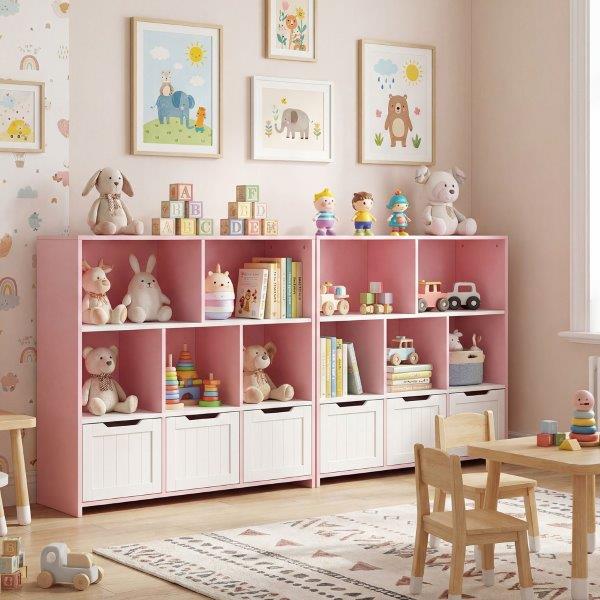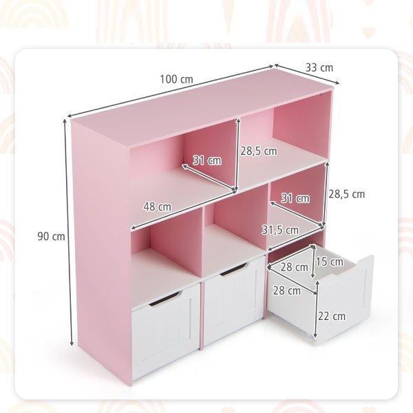 Ši specialiai vaikams sukurta daiktadėžė siūlo daug vietos daiktams susidėti ir patrauklią estetiką, suteikdama žaismingumo ir gyvybingumo bet kurio vaiko miegamajam, žaidimų kambariui ar vaikų kambariui. Pagaminta iš aukštos kokybės MDF, ji yra tvirta ir stabili, garantuojanti ilgą tarnavimo laiką. Penki atviri skyriai ir trys erdvūs stalčiai leidžia vaikams lengvai laikyti ir eksponuoti įvairius daiktus, tokius kaip žaislai, drabužiai, knygos ir daug daugiau, paverčiant netvarkingą kambarį tvarkinga ir organizuota erdve. Kiekvienas stalčius turi sklandžiai riedančius ratukus, kad būtų lengva atidaryti ir uždaryti. Stilinga balta ir rožinė apdaila – puikus bet kurių namų papildymas. Puiki dovana vaikams!