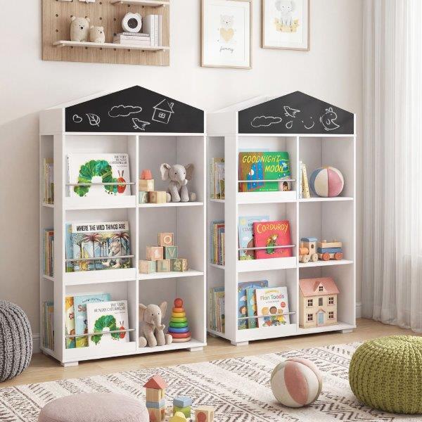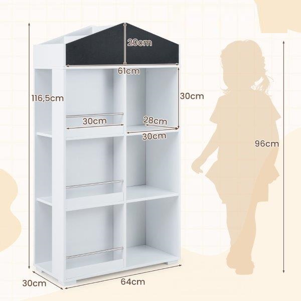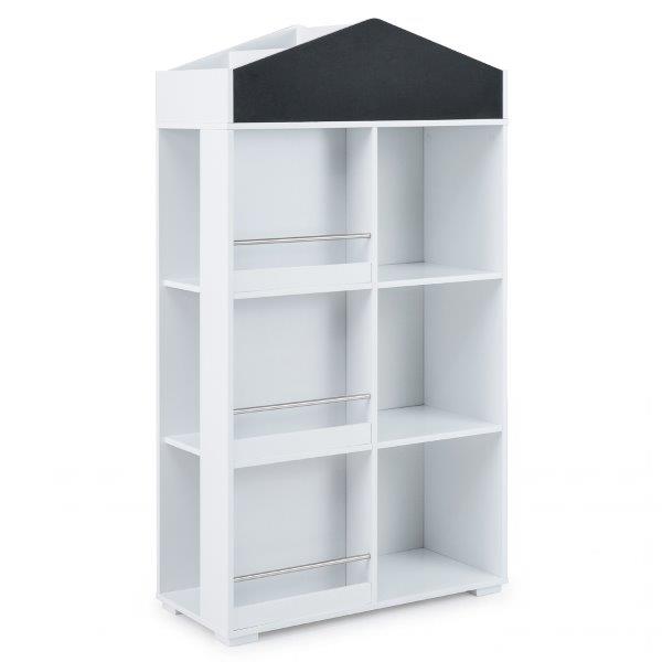 Meiliai sukurta mėgstama vieta knygoms ir mažiems lobiams. Ši vaikiška knygų lentyna siūlo daug vietos knygoms, paveikslėlių knygoms, lėlėms, paveikslų rėmeliams, konstruktoriams ir dekoratyviniams daiktams, nes joje yra keturi viršutiniai skyriai, trys šoniniai skyriai ir priekinės lentynos bei skyriai. Knygų lentynoje taip pat yra lenta, kurioje vaikai gali išlaisvinti savo vaizduotę ir kurti savo piešinius ar raštus. Žavinga namelio forma suteikia žaislų lentynai ypač patrauklią išvaizdą.