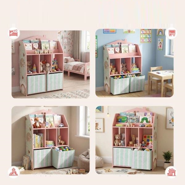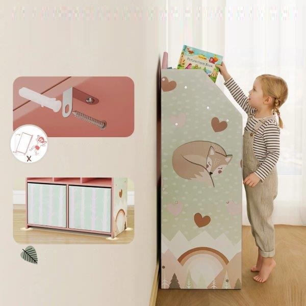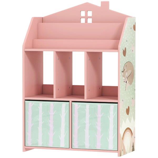 Žaismingo namelio dizaino ir rožinės lapės motyvo žaislų lentyna kasdienį gyvenimą paverčia linksma ir organizuota erdve. Vaikams pritaikyto aukščio lentyna leidžia mažiesiems lengvai pasiekti, laikyti ir savarankiškai padėti knygas bei žaislus, taip skatinant pasitikėjimą savimi ir savarankiškumą. Pagaminta iš FSC sertifikuotų, tvirtų lentų su apsauga nuo apvirtimo, žaislų lentyna užtikrina saugų ir ilgalaikį saugojimą.